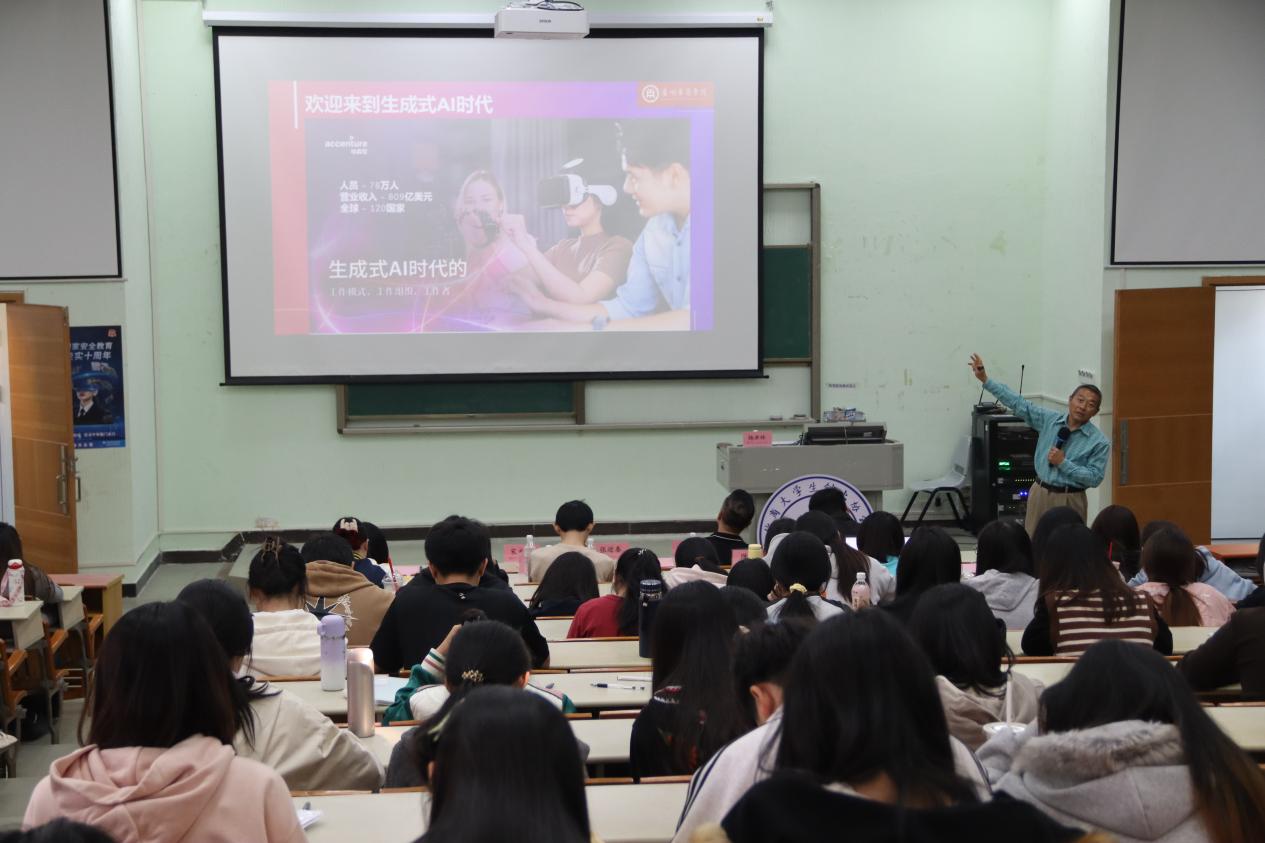 杨洪林老师则是以《AI时代:大学生的职业规划》为题,结合其在 IBM、埃森哲等企业的管理经验,系统剖析了生成式AI对职场生态带来的根本性冲击与历史性机遇。他指出,AI不仅意味着岗位形态的变革,更将推动人机协作、创意决策等新兴需求的蓬勃发展。